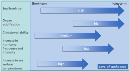 Les populations, les infrastructures, et les écosystèmes sont souvent fragilisés et soumis à plusieurs risques reliés aux changements climatiques : augmentation du niveau de la mer, augmentation de la variabilité climatique, intensification des ouragans, augmentation des températures de l’eau, acidification de l’océan (Figure 1).
