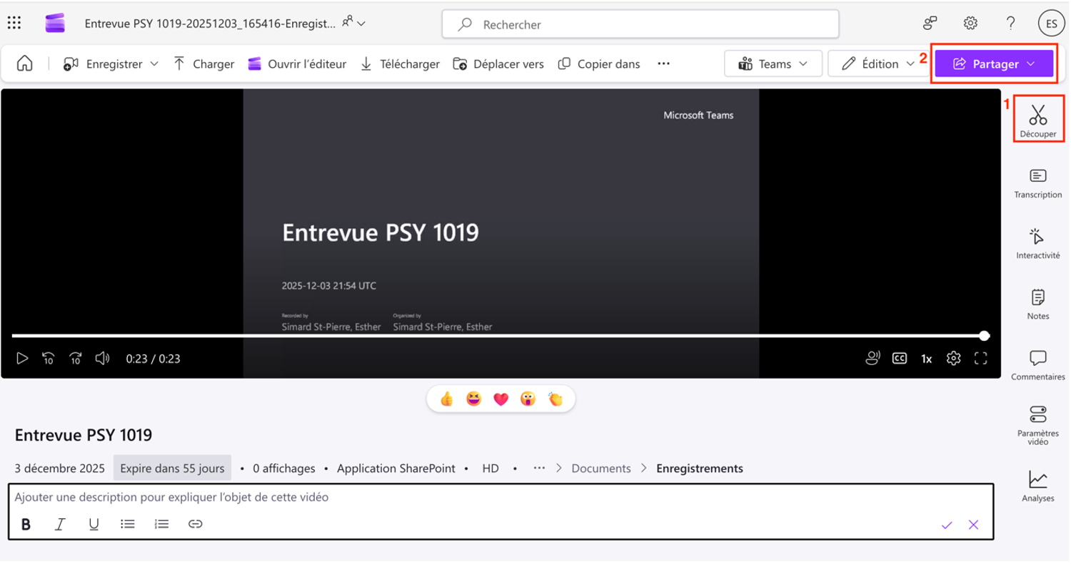 - Dans l’interface d’édition, vous trouverez plusieurs options, notamment Découper, qui vous permet d’élaguer un segment de votre vidéo (1), ou encore Partager (2).