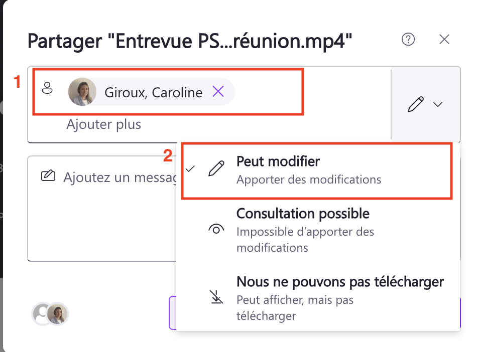 - Par défaut, le partage concerne des personnes en particulier que vous pouvez notifier par courriel. Si vous devez fournir un lien de partage, inscrivez le nom ou l’adresse courriel de la personne (1) avec qui vous souhaitez partager votre lien.